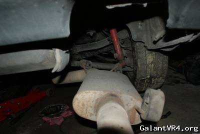 Now that the axles are out, you're going to need to drop the exhaust, at least in the rear of the car. I just pulled the 3 rubber hangers near the muffler, and it gave me the space i needed.