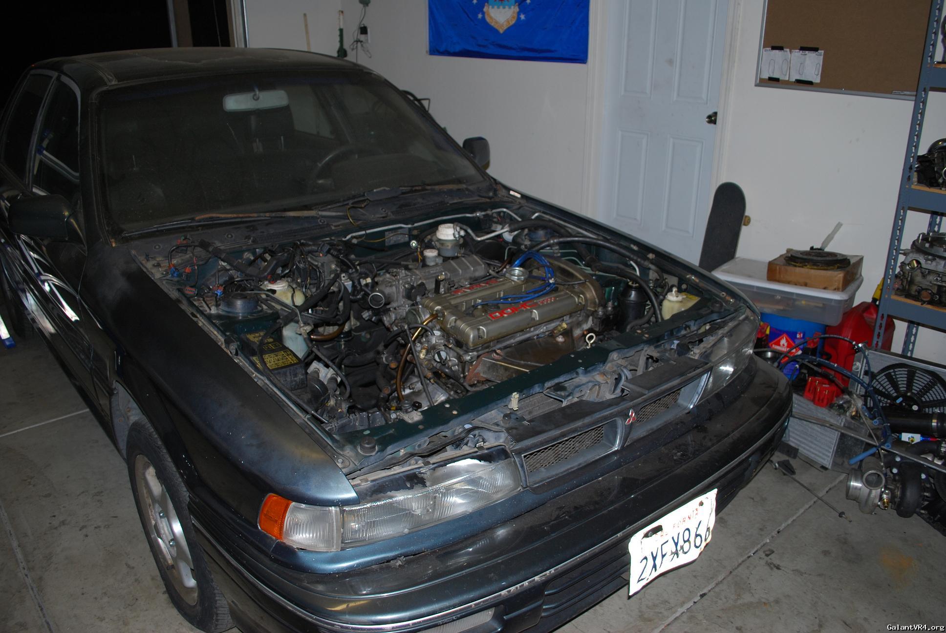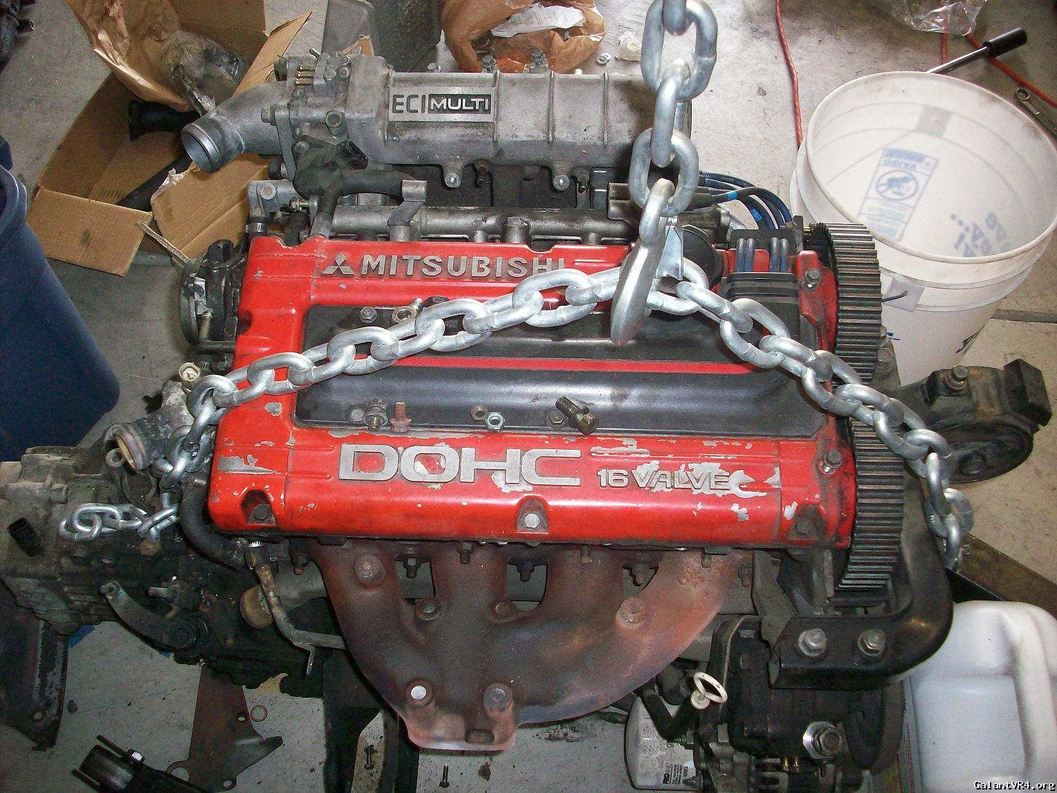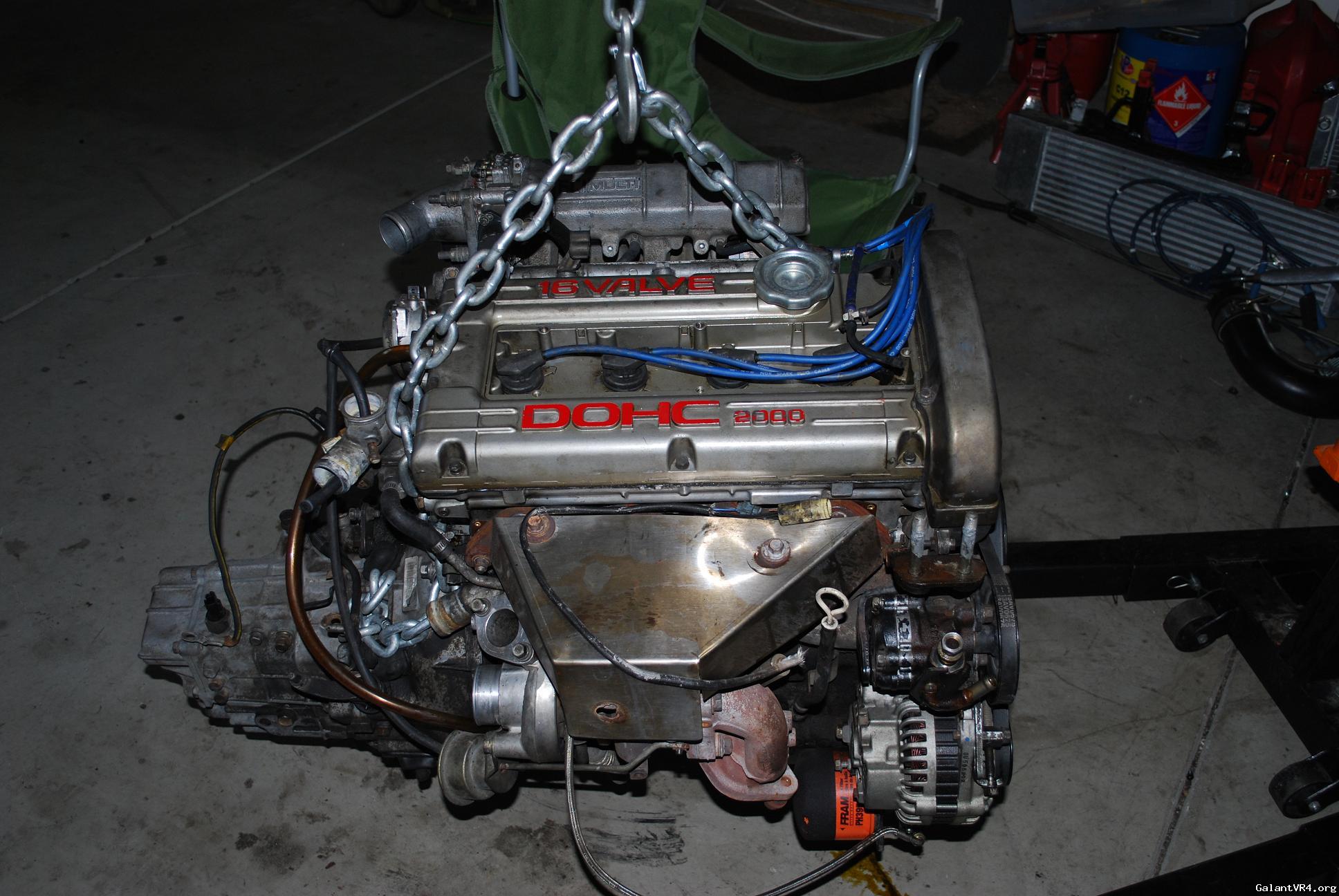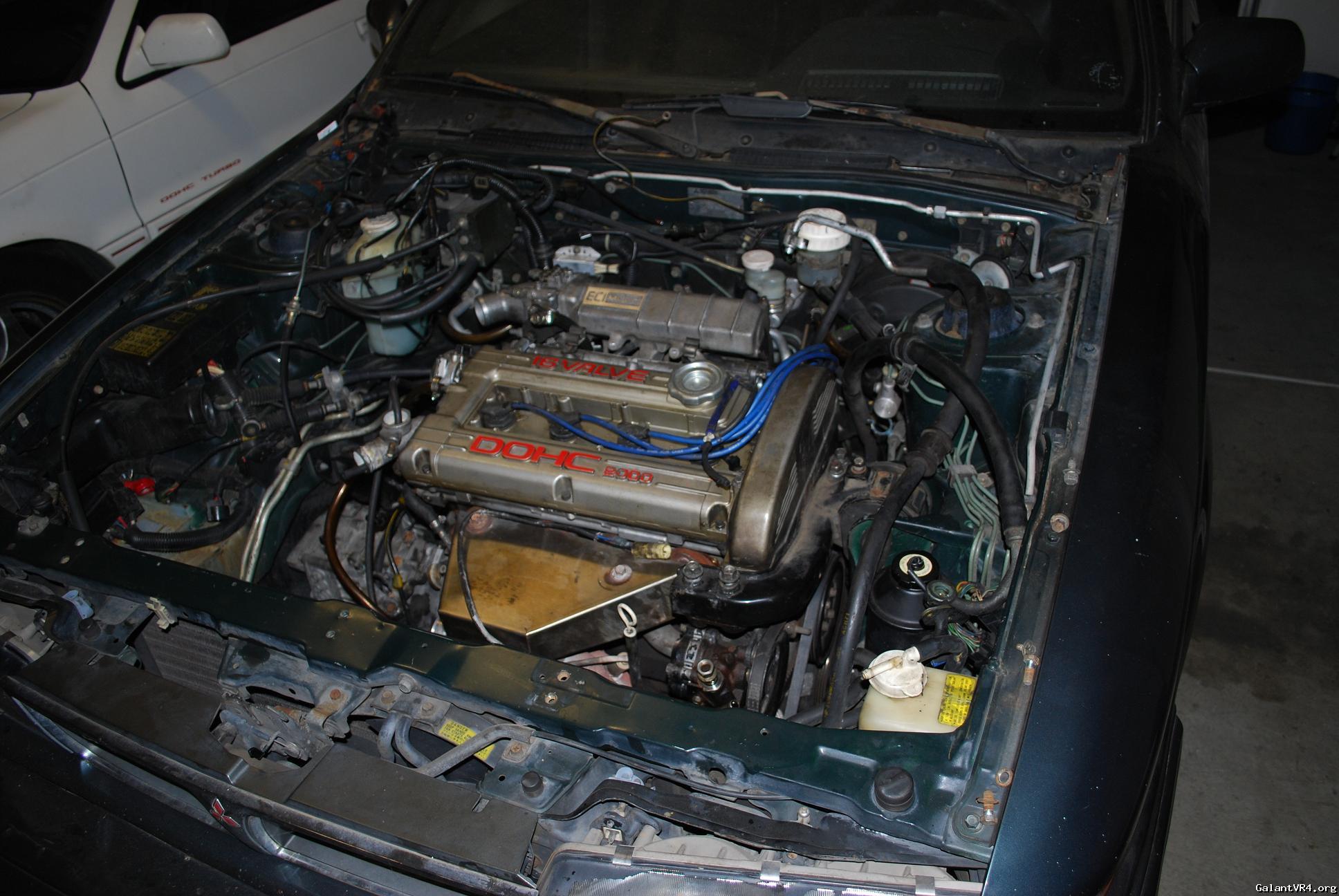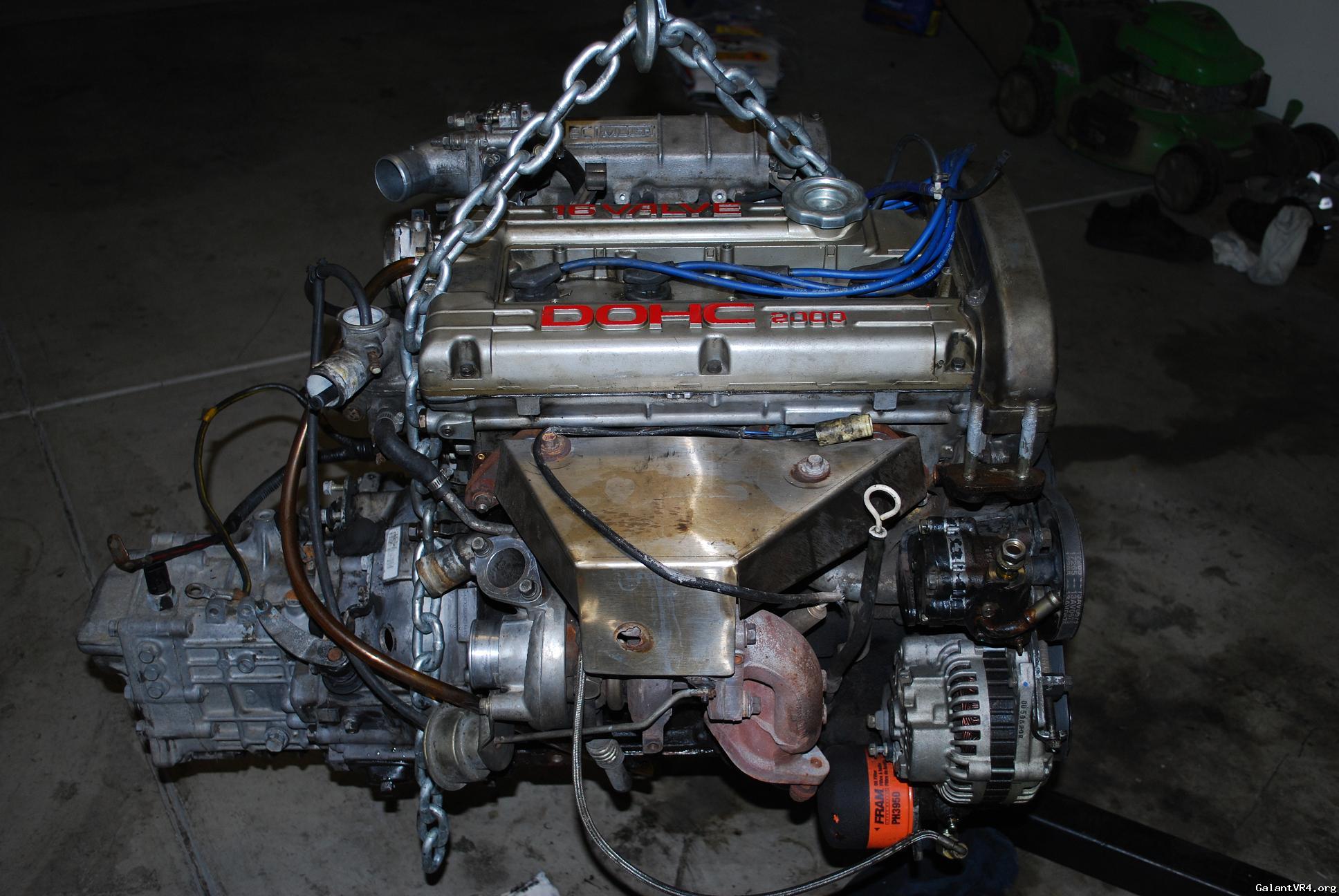 I decided to just go ahead and start a build thread for my first Galant VR4 #435. I am pretty new the board but I am trying to weasel my way in and get to meet some people. I was a big honda lover but crossed over to Mitsubishi about 2 years ago after buying a original 89 Colt GT. I picked the VR4 up almost 2 months ago from a the second owner of the car . The car suddenly quit running one day and the owner decided to store it for 6 years? /ubbthreads/images/graemlins/dunno.gif Owner said he though it was electrical related but I didn't really care being the car was only $900. Car has a clean title pretty good body besides some front end dents and clearcoat issues. It even came with the original matching key ring badge and key. I found the original Dealership window tag with the fuel ratings and price tag in the glove box with ful maintainance records. When I got the car home I pulled the timing belt cover off to find a snapped timing belt... So I pulled the motor within a few days to start a rebuild.
