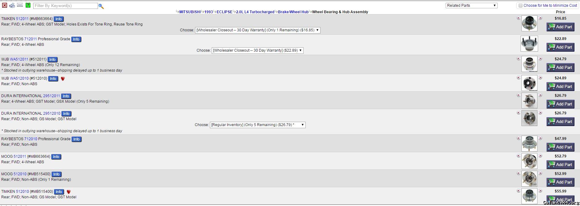Not trying to beat a dead horse here, but I'm not having any luck searching. I believe it has been said before than you can get the rear hub complete from auto parts stores, and all I'm seeing is the rear hub for FWD cars. Can anyone help me out? The junk yard an hour away has two 1G Talon's on the lot that I was going to grab the front 5-lug hubs from. Based on what I'm seeing, I better grab the rears too.