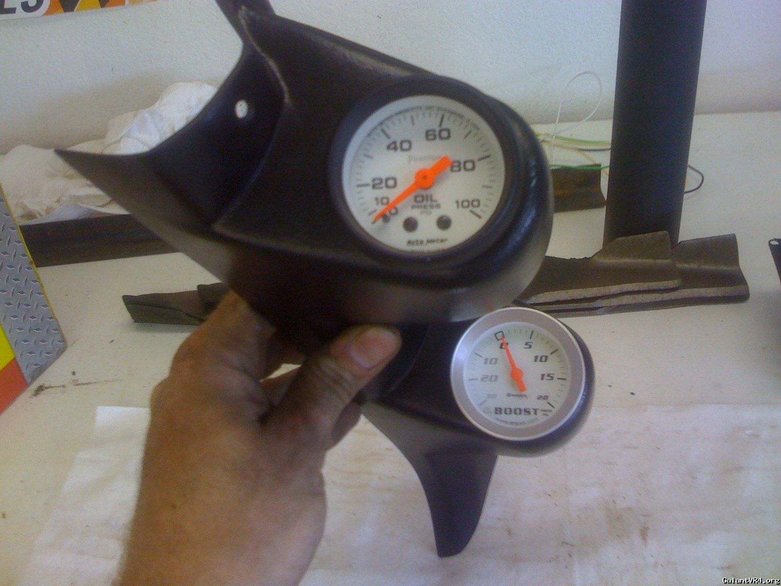 I made a bracket to mount an oil pressure gauge in the A pillar pod. Also, note the cheap ass boost gauge. I don't know where he got it from. It screws together into the gauge pod. I'm tossing that thing next paycheck for an Autometer one.