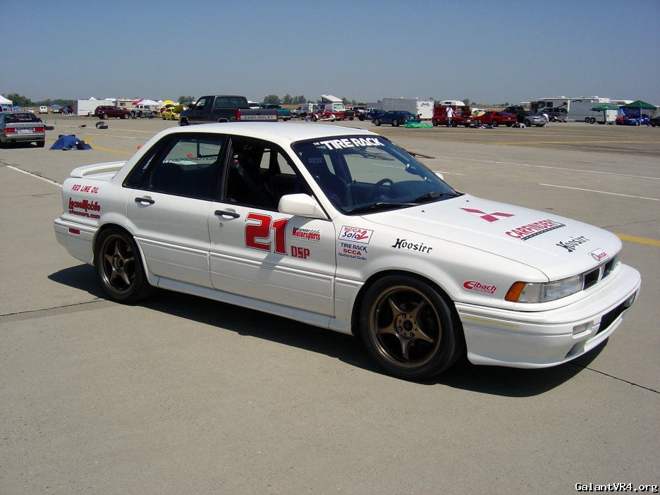 The current kings of DSP are 3-Series BMWs, with the Integra Type R, Subaru 2.5 RS & a few others just a bit behind. The top BMWs of course are RWD, have about 200WHP & weigh about 2800-2900 lbs. So, the Galant looks pretty good with AWD, & should be about 280-300WHP (if set up properly) & around 2900-3000 lbs. I am pretty happy with the way the car currently handles, but I would like some better shocks/struts (I have AGXs now). Will Konis made for a 1G DSM work in our cars? The other thing I need to address is power. Per Street Prepared rules, I can run any intake & any exhaust on a stock long block, & turbo cars are allowed unlimited boost pressure. But, I have to use a completely stock turbo & wastegate assembly, as well as the BOV. Is 300WHP possible with a stock 14B & stock engine at 20+ PSI? What would the best fuel setup be to get that result, or whatever the best result possible? I currently have 650s with the big Walbro pump, would I need smaller injectors even at 20+ PSI with a 14B? Let me now what you guys think, I will try to keep everyone posted as the season goes how the car is doing! The attached picture is actually when I first built up this car. I originally set it up for DSP back then, but in those days turbo cars had to run stock boost levels. Even still, on skinny 225s (the class winners all run 285s or bigger) & only 9.5 lbs of boost I still trophied at the only National I ever entered with it /ubbthreads/images/graemlins/smile.gif