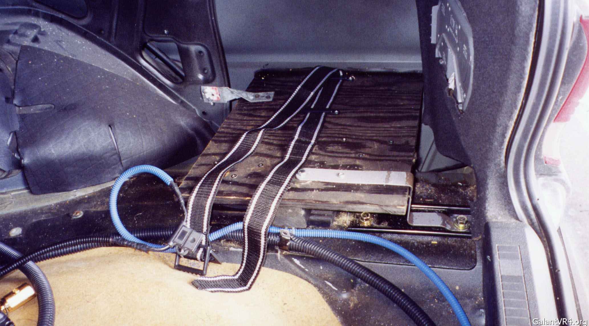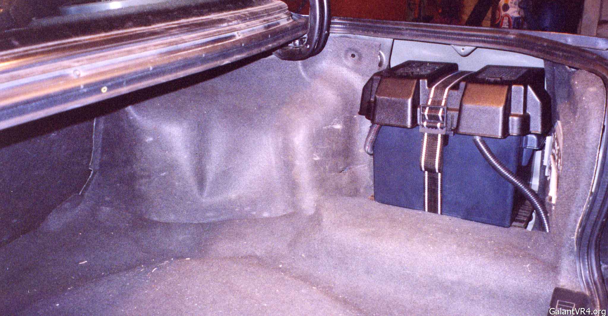 So here it is. Months of planning, measuring, tweaking cardboard mock-ups and parts gathering. The ultimate goal was to keep a stock appearance (minus the ricer blue wire loom) and to maximize the limited trunk space by utilizing that void. Solution? Build a bridge. It may not look it in the pics, but the battery mount is very, very stout... just not NHRA legal.