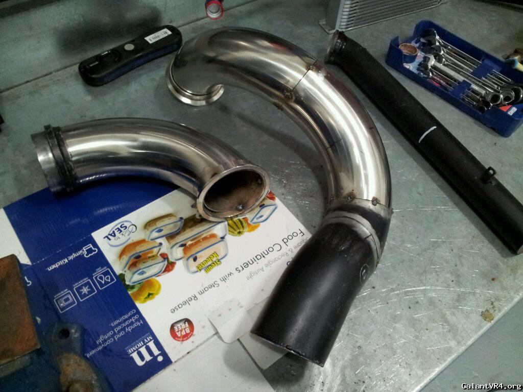 Anyway, photos of the dump pipe. All the cutting complete. Just need to tac a few more welds then off the get tigged at the workshop. Everything fabbed at home when the wife and baby are sleeping at night. Used a mix of stainless and mild steel simply because it will be coated and I had the correct bends lying around. 3.5" turbo out to 4" to the cat.