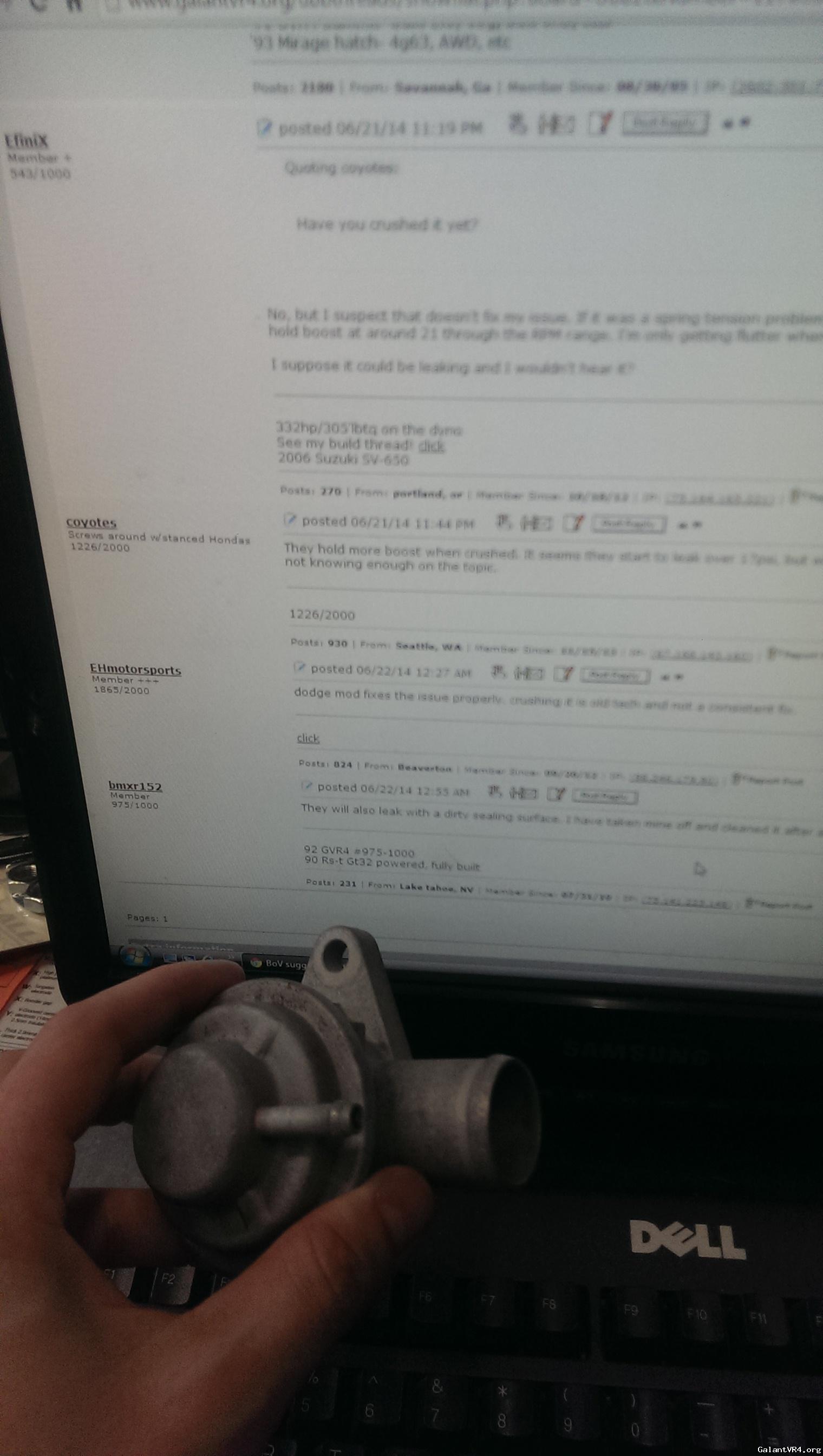 I met with EHMotorsports yesterday and we knocked out a dodge mod BoV in about 3 hours. The result of the mod was interesting. I actually noticed I was still getting a bit of flutter at higher boost levels. This behavior abruptly stopped when I blew my recirculation hose clean off the intake. Venting to atmosphere resulted in no flutter whatsoever. My BoV hose has a nasty bend in it, the result of using too-short of a connection. I'm guessing the tight bend the hose had to make to get into the intake pipe (right after the MAF, of course) was creating just enough back-pressure to flutter the valve. I'm going to fix this today with some new hose and report back. I'm guessing this issue goes with a new dump hose.
