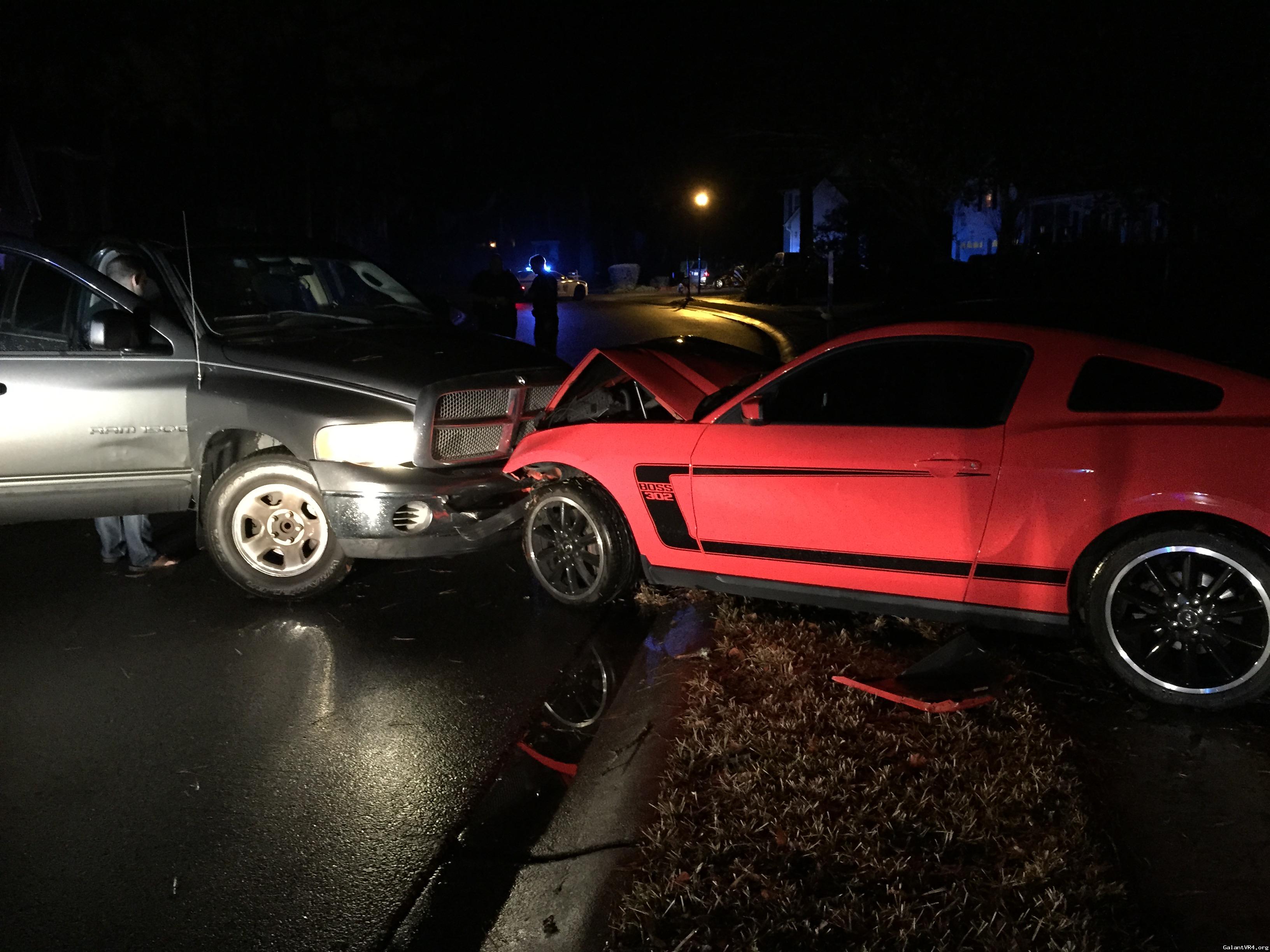 About a week later I was at the same buddy's in-laws house and had just gotten back from a beer run. I parked the Mustang on the street because I was tired of scraping the front splitter on the driveway. (I never do this) About 45 minutes later, we are playing forza and hear a car revving up outside and spinning the tires. I immediately think someone is stealing the Mustang and run to the door. Luckily no one was stealing the car...Unluckily, it was now parked about 50 feet away...in the yard...with a dodge ram scissoring it. Needless to say I was a little shocked, especially as I notice the guy is still burning out first and reverse trying to leave.