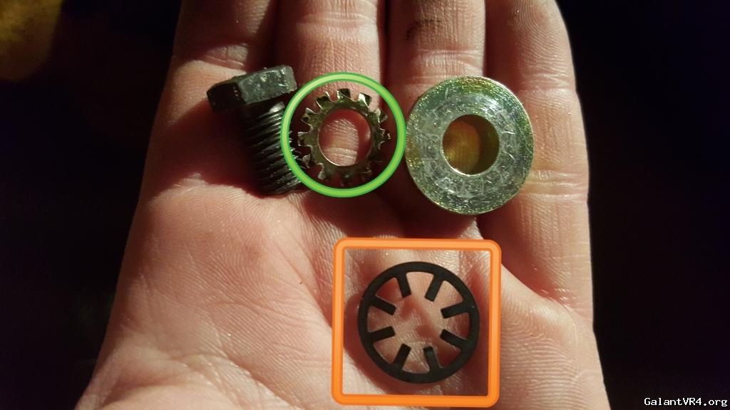 Be very careful, there is a thread washer on the back (orange) and a lock washer on top (green) of the bolt.