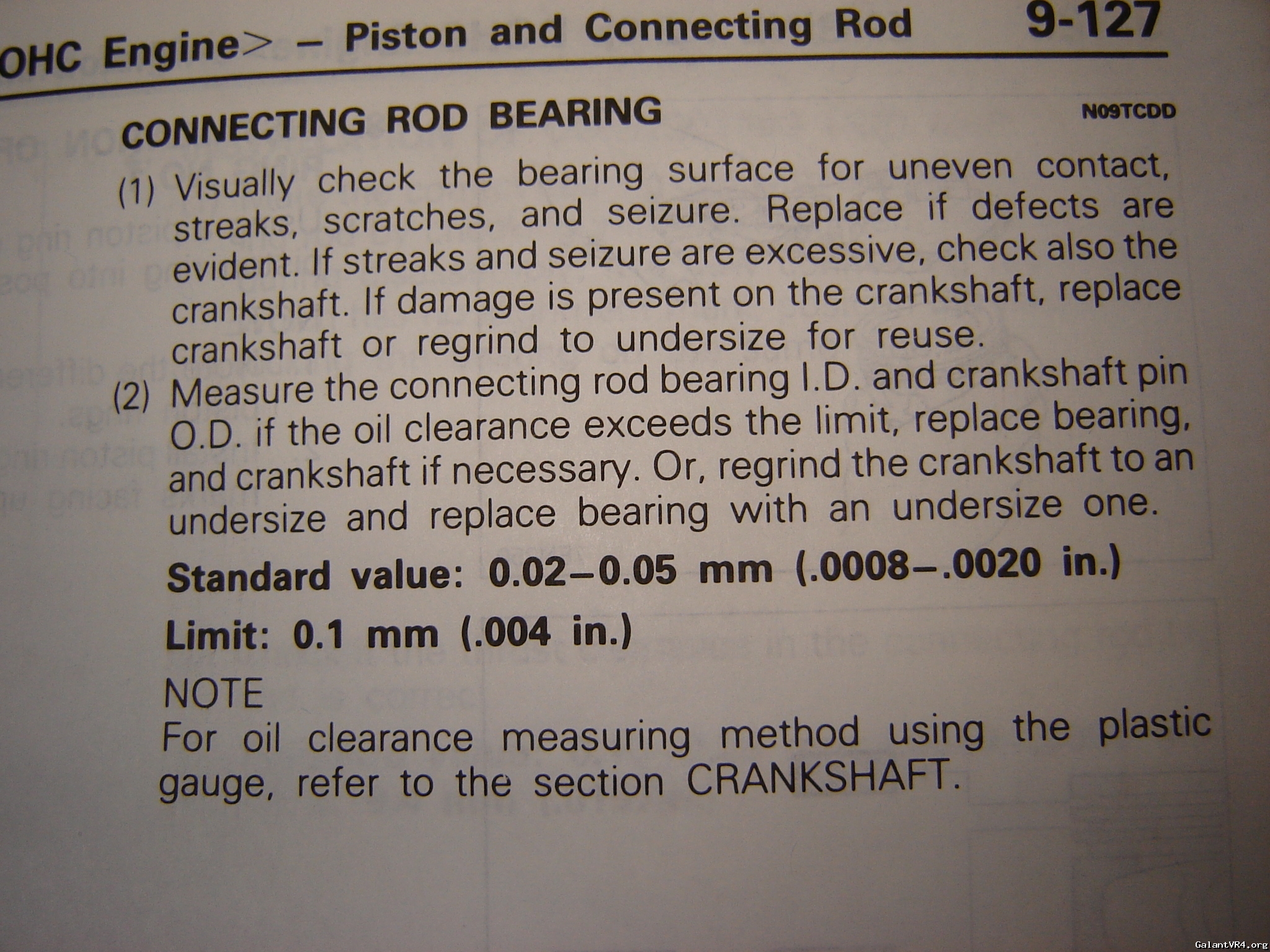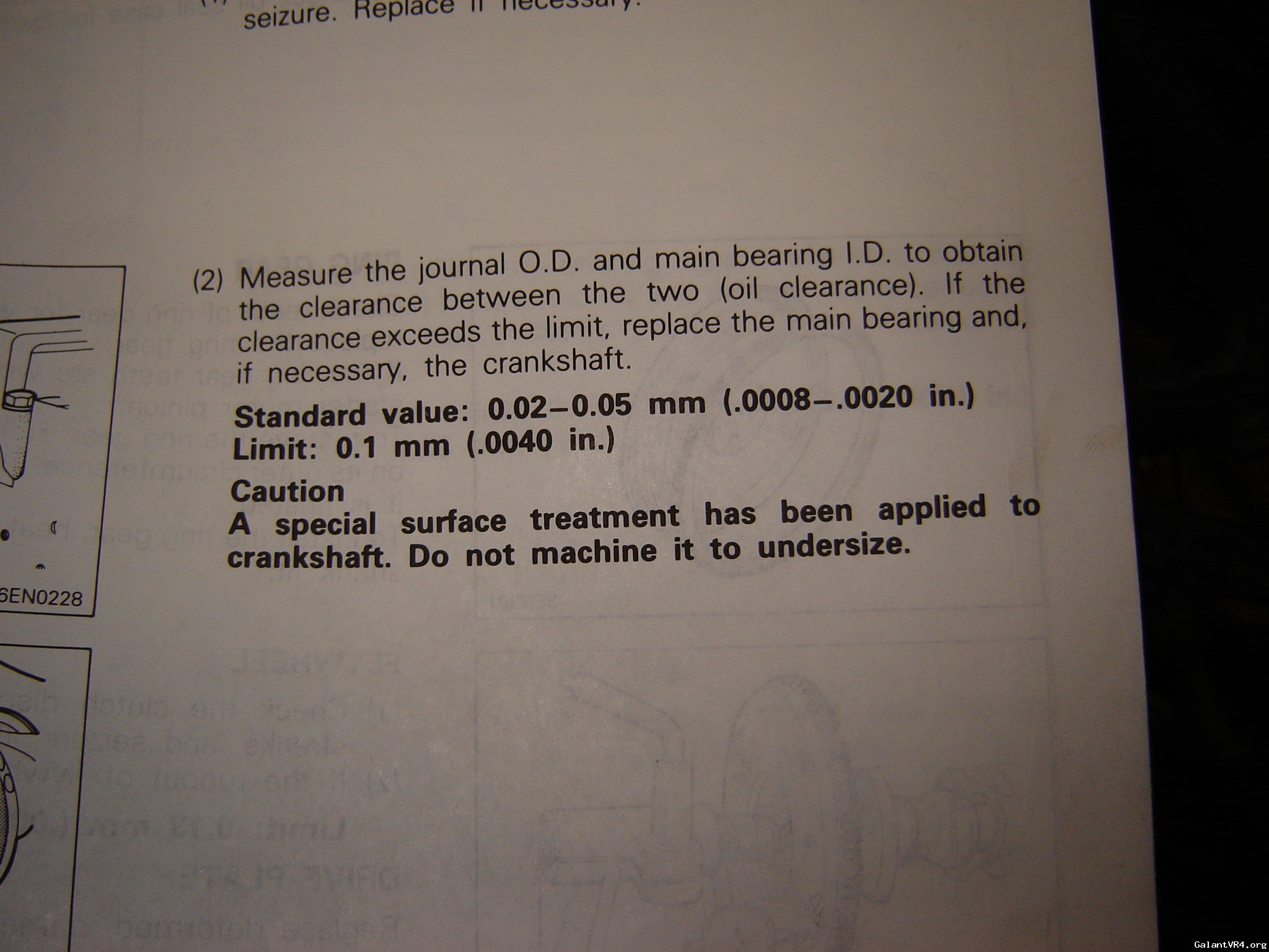 So I pulled the motor out of 1387 tonite and was checking all the tolerances. While I was refferencing my Mitsu manual, I came across two contradictions a page apart. One page says dont grind the main journals of the crank, the other says if the tolerances of the rod's are bad, have the crank reground. I guess my misunderstanding is because the first part says that the crank has a special treatment done. Wouldn't that mean the whole crank had it done and not just the main Journal's? Sooooo which is correct??? You be the judge.