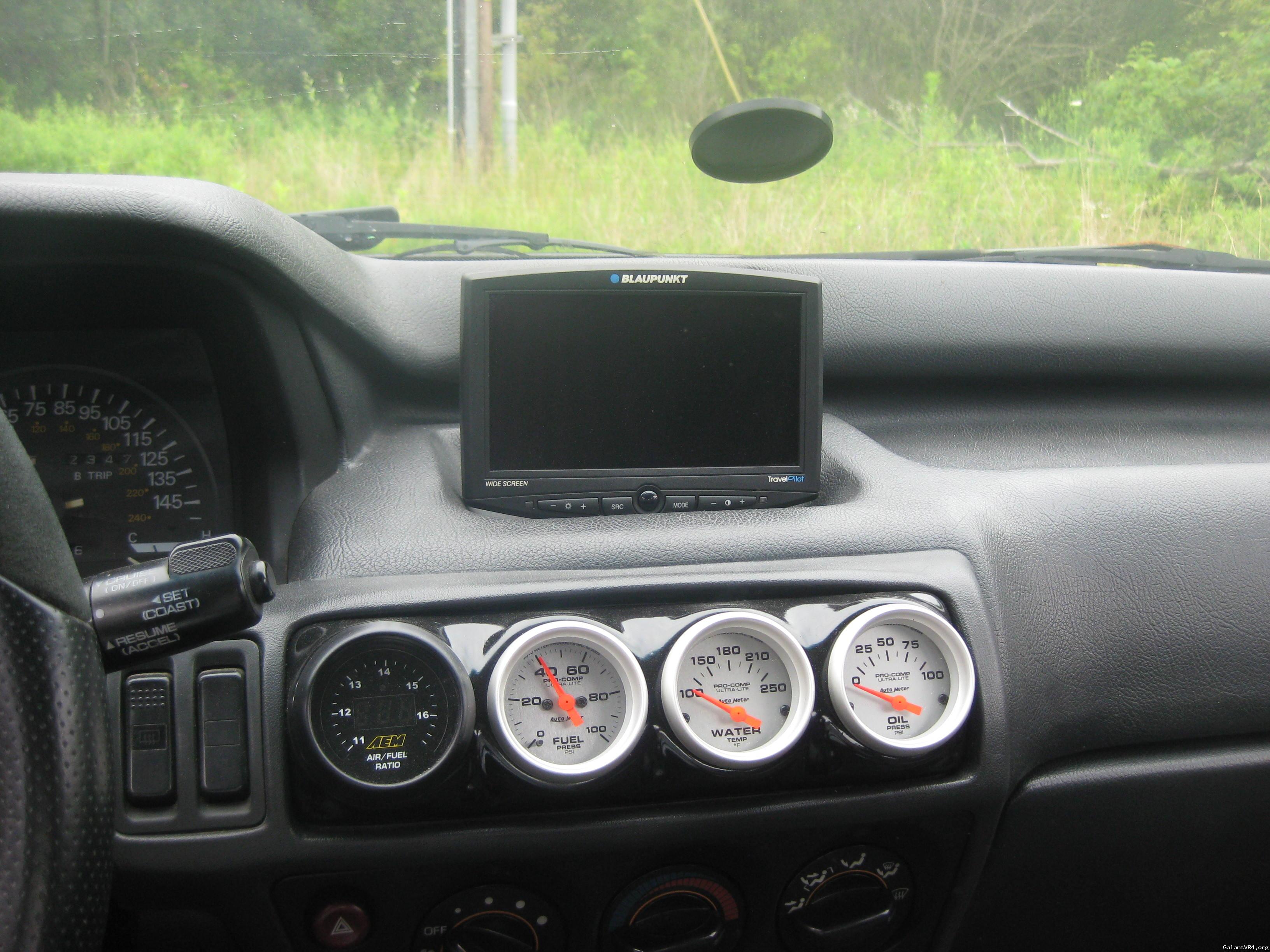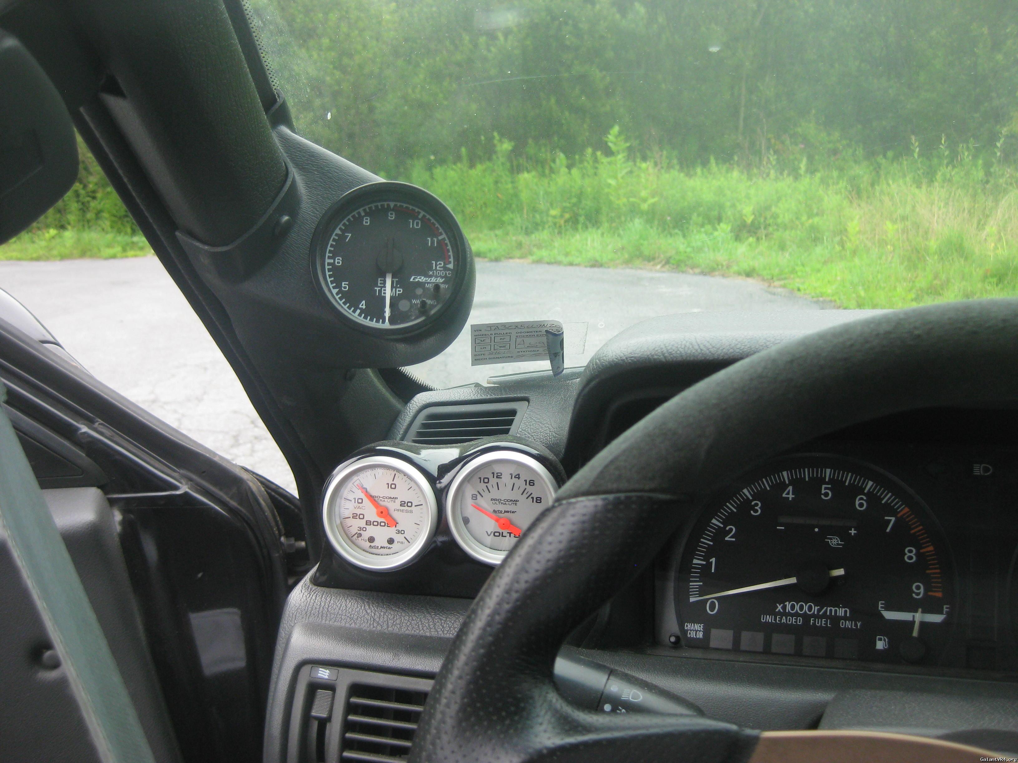 Custom gauge pods, housing AEM wideband, Autometer 30/30 boost vacuum, electronic fuel pressure, electronic oil pressure, and greddy EGT