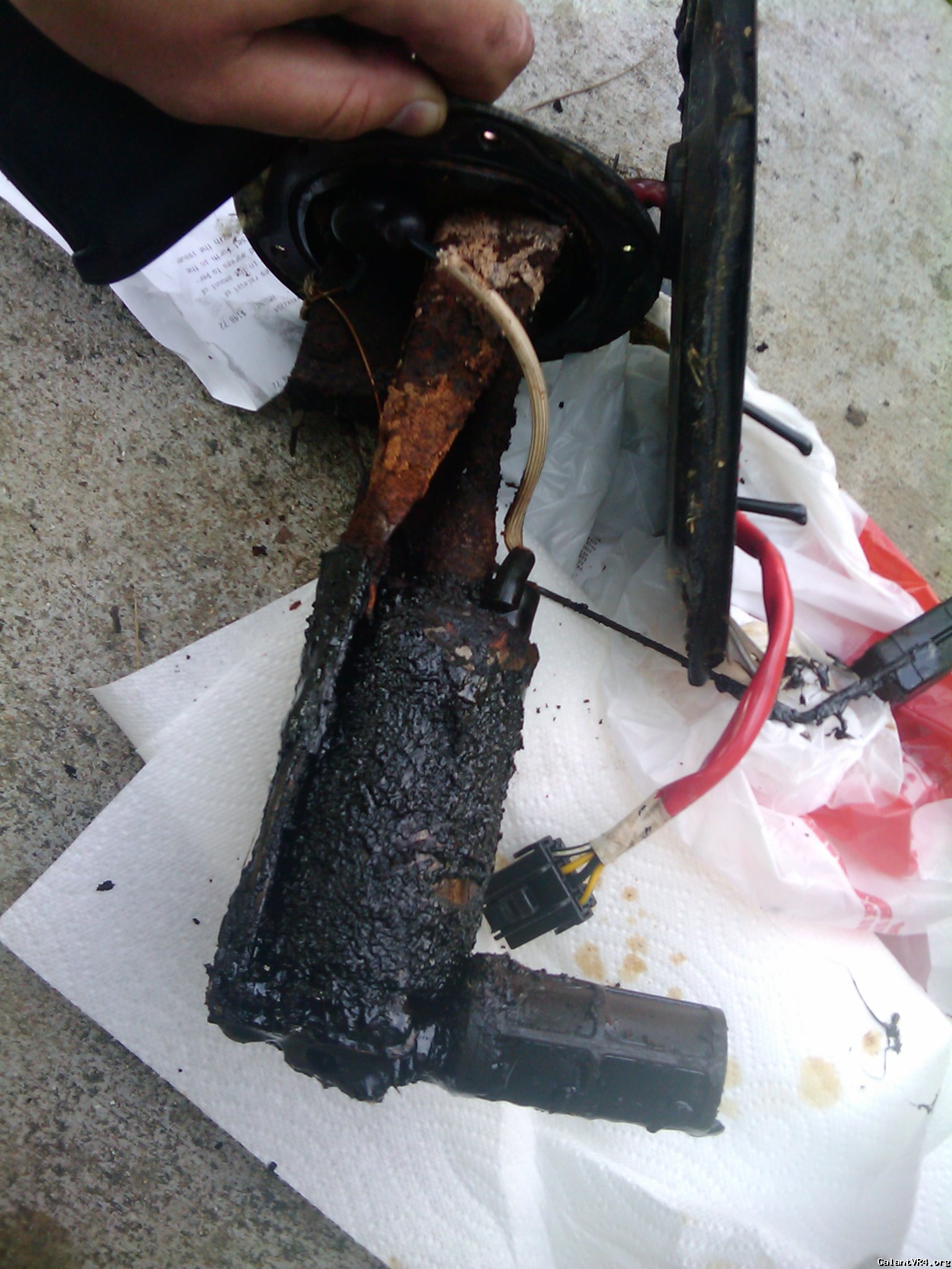 Well I picked up a 91 Talon AWD auto for 800 that had the engine replaced but did not have a computer. The car had been sitting at a shop for over two years. I got an ecu for a manual replaced the caps on it. Found that the 20A MPI fuse for on the possitive battery conectiong was removed and shorted and the EFI relay was unpluged fixed all those and could not get it to start. I noticed the fuel filter was leaking, some really digusting smelling fuel. I replaced the fuel filter, and decide I need to empty the fuel tank of all the old gas. This is what I found when I pulled the fuel pump.