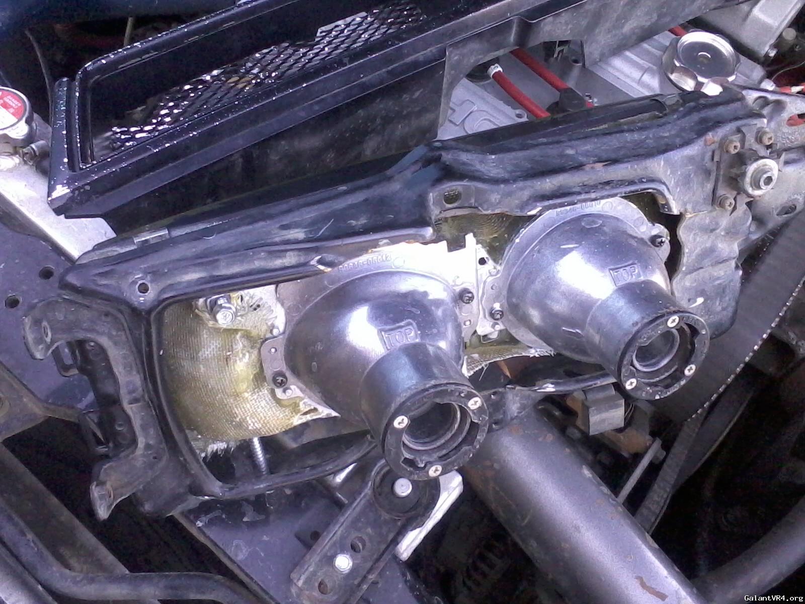 the two projectors are stepped about an inch stock. this works, but my intercooler pipes got alittle snug to the bulb so i separated the two projectors and mounted each separatly. i had to cut the factory housing up extensively. i used fiberglass resin and mesh to put it back together.