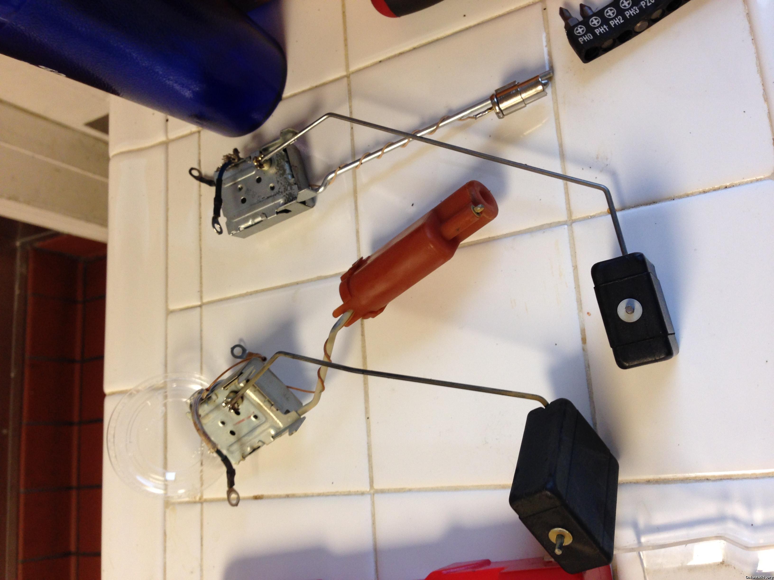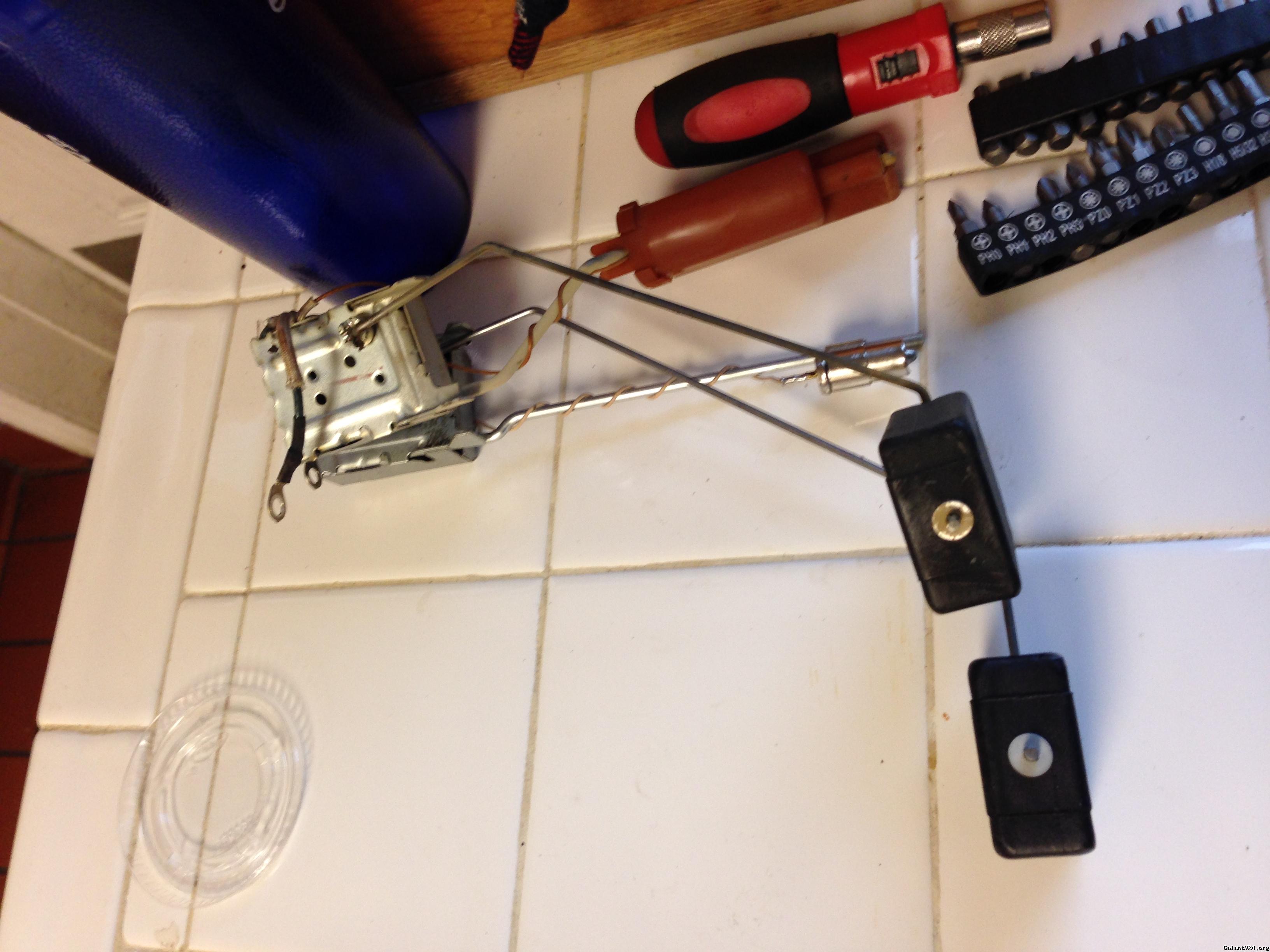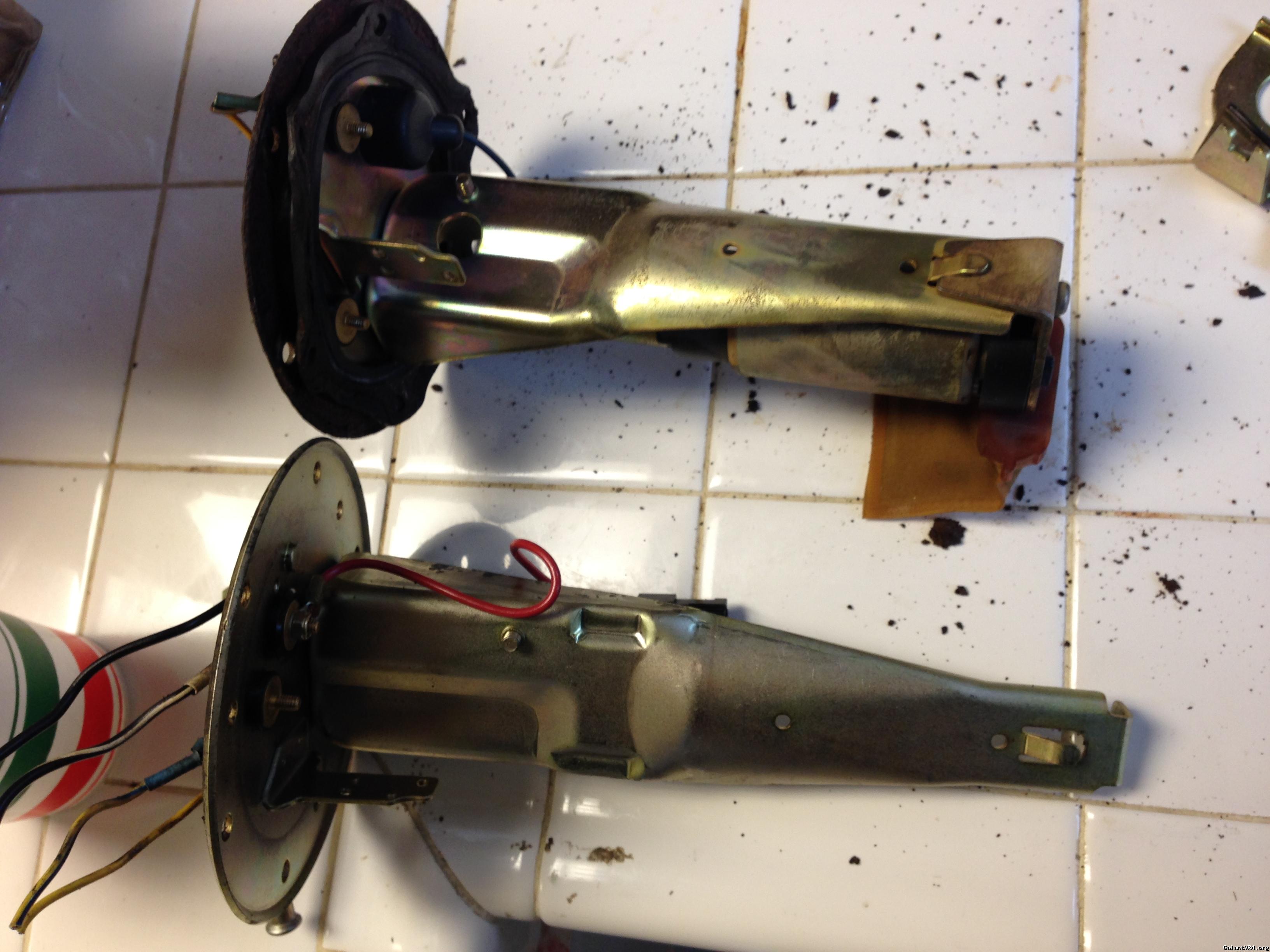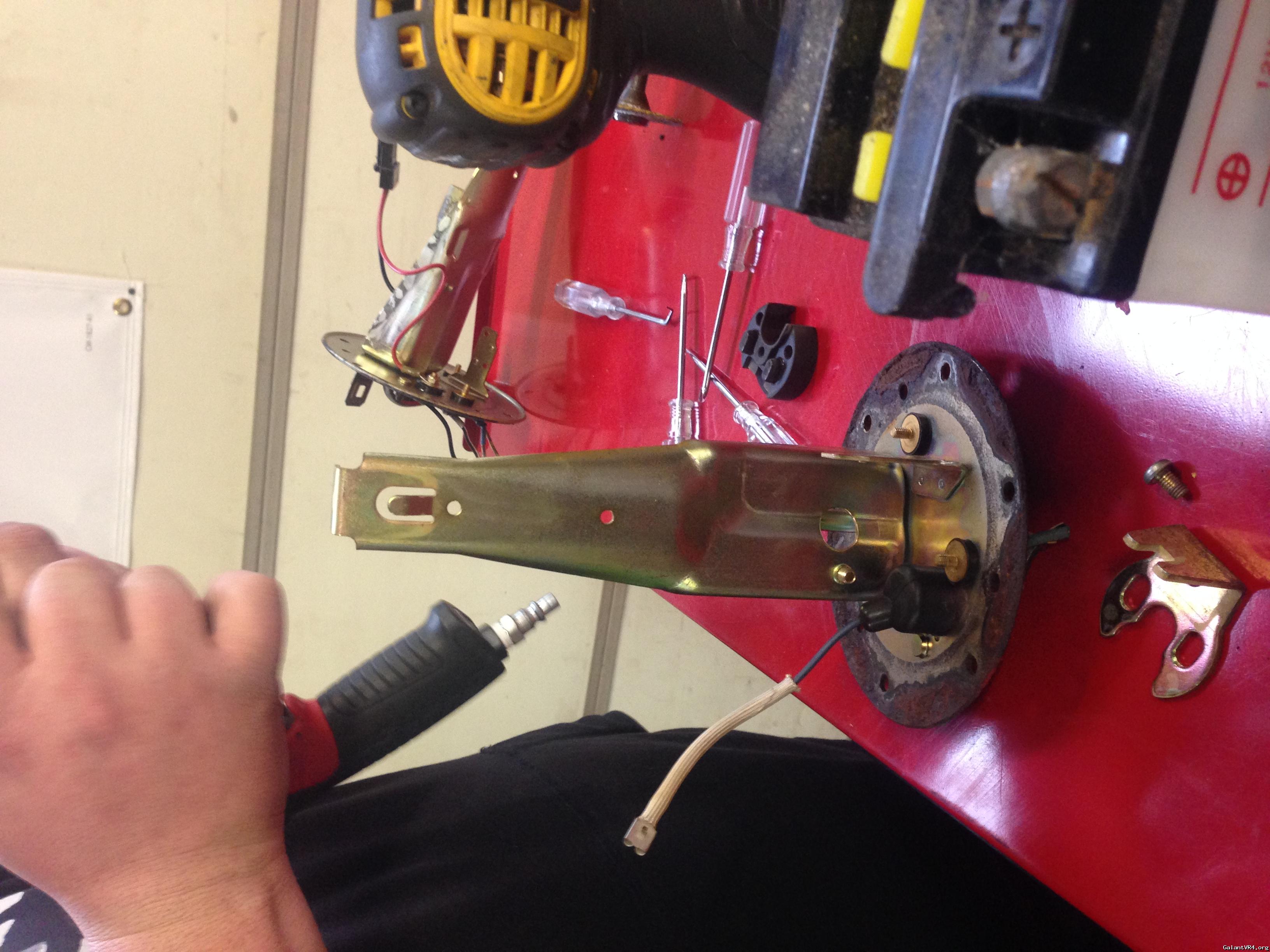 the fuel pump on the vr4 went bad, and the sending unit looks pretty bad as well when took the cover off the car. so, I decided to change the whole unit if possible, along with the new fuel pump. initially, I thought about the RTM fuel unit setup, but too much. then I went on to look for a cheap replacement fuel pump for now before I figure what to do with the cover. then I found this fuel sending unit w/ fuel pump came off a 1991 Eclipse turbo AWD. I was excited cuz the unit looks identical, and I was hoping for a direct drop in to get my car running. don't laugh, I am a newbie to vr4. I didn't know the 1g DSM tank is deeper than that of vr4. so, I found out the eclipse unit is about 1 1/4 inch longer than the vr4 one. after few thoughts, and talked to my friend, I decided to modify the eclipse fuel sending unit to make it work on vr4 since the cover, and wiring on it are so much better than the original one on vr4. here are the steps what I did: