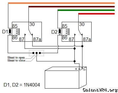 For anyone that wants to wire up JDM power folding mirrors, here's you do it. First you need four relays, a dual momentary switch and at least 7 rolls of different color wires. You will be pairing up the relays and wiring them like this: