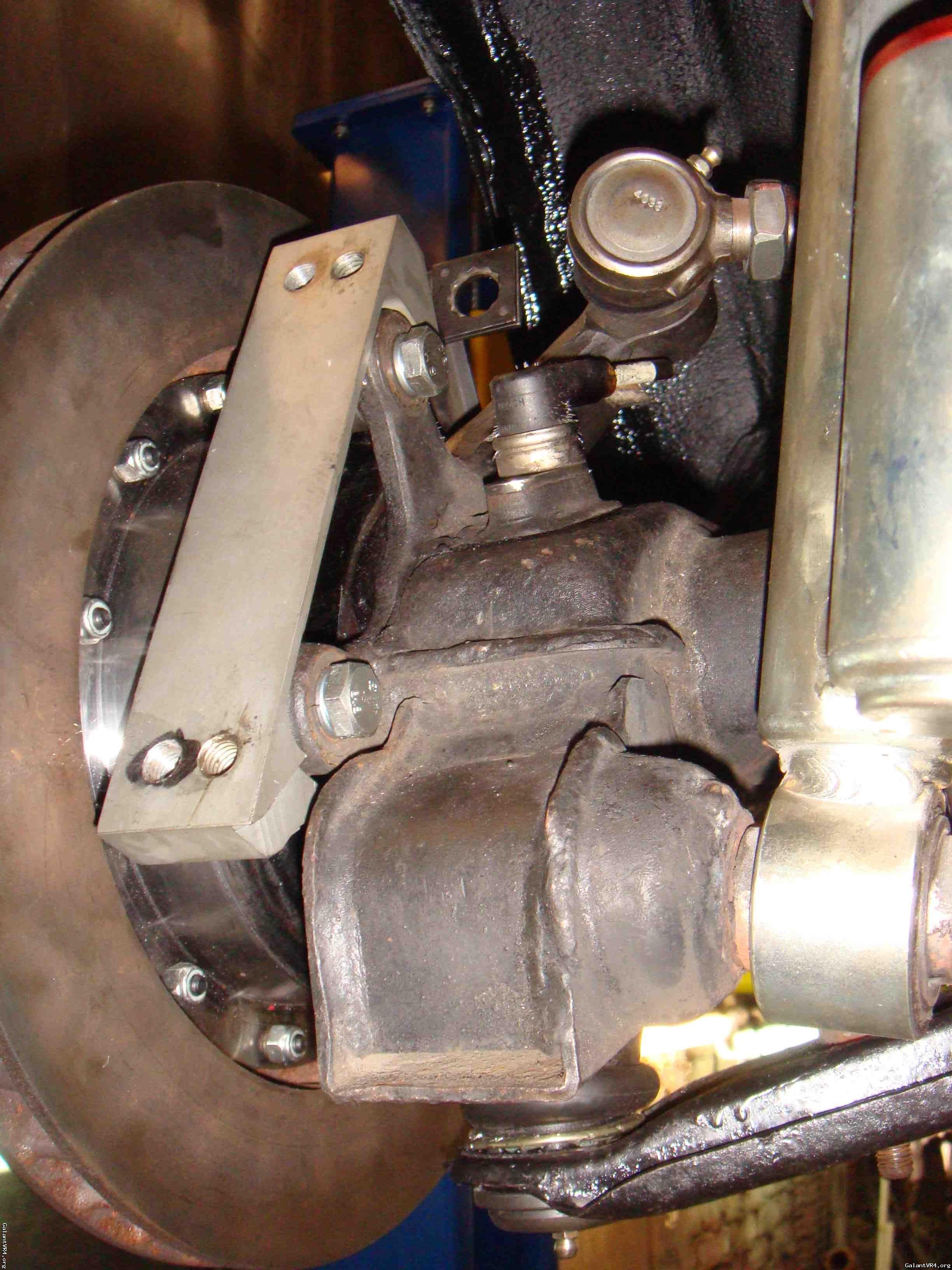 When Ken told me last night that the suspension mounts had to be raised to make this work I thought he meant adjusting the spring perches or top mounts. In fact he was talking about that lower mount. He doesn't modify the suspension or use longer struts (although he says that does work). Instead he cuts the VR4/DSM mount off the stock arm and welds it on to the 3KGT arm to give it identical mounting points/geometry to the VR4 one.