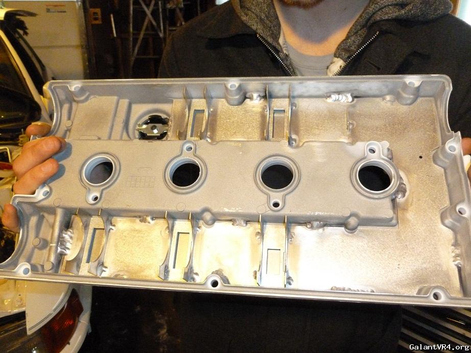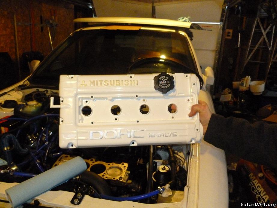 Had my Mitsubishi valve cover restored since it was ruined by a shitty sandblaster. Ordered up a new laser cut baffle from Kevin Kovatch, a freelancer on DSMTuners and owner of CompWorks. My buddy Matt took the old baffle out and had his work do the cleaning, blasting, welding in of baffle, and re-coat. Turns out they did a bad job welding in the baffle once I went to test-fit. Since there was contact with the cams, I had to order another baffle and have someone else do the work properly. Sent the valve cover to Detective Coatings and they did an excellent job removing the poorly welded baffle and put in another one. After another coating of gloss white and some polishing of the letters, I am very happy with the outcome. Replaced the Bonehead oil cap with the Evo cap and I like it.
