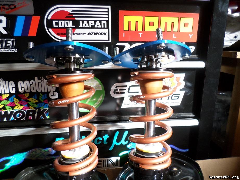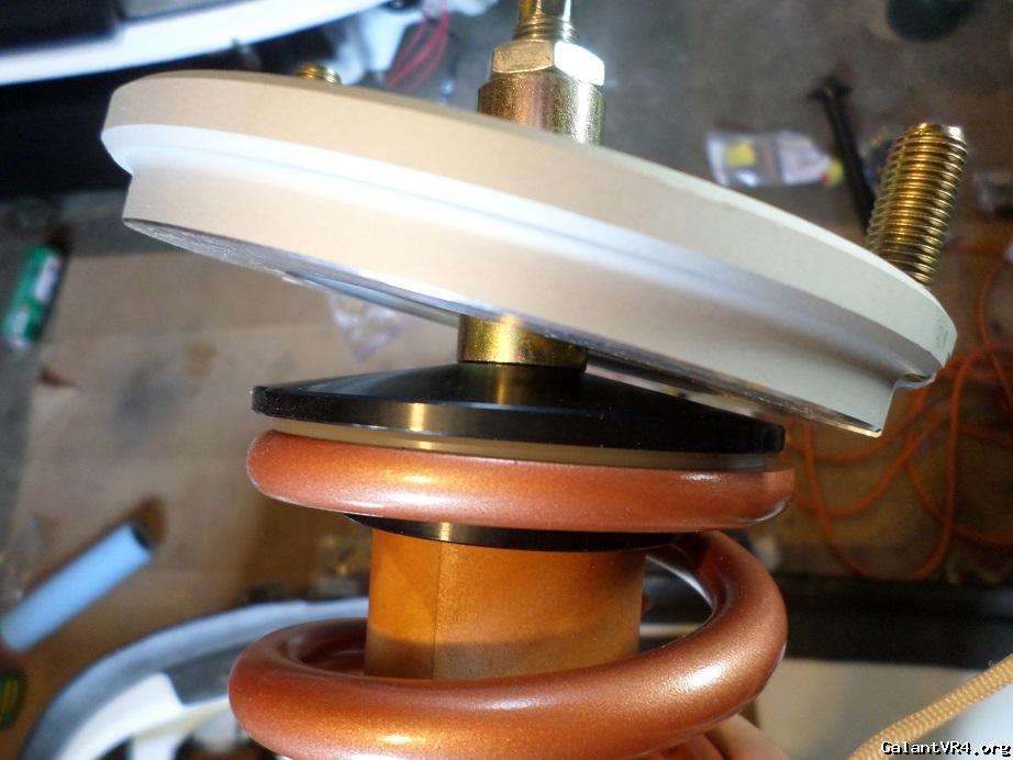 Rears complete. I flipped the pillow collar to get the proper spacing and used the shorter washer for the top of the plate. Bob at the shop machined the pillow collars and washers for me just a tad over 12mm to fit since they were designed for a smaller strut shaft. The shafts are perfectly centered and do not move around. Finished off with Koni nuts.