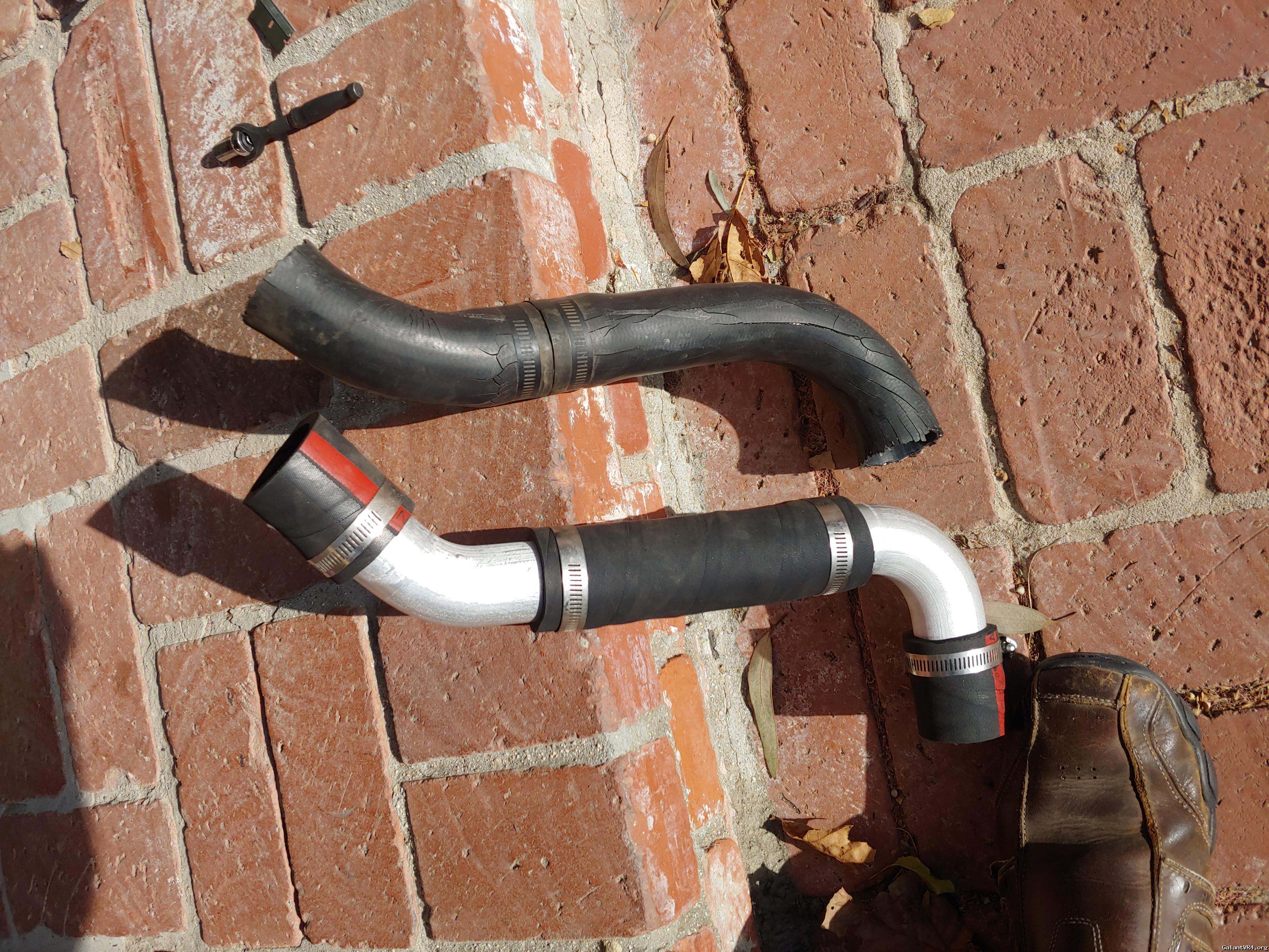 Jump online, only to learn that stock size rubber elbows were no longer available. At least I couldn't find them. I considered an exhaust shop for a one piece solution, but didn't think they could make right enough bends. The best solution I came up with was stock od aluminum elbows for intercoolers. Mated with J1527 marine hose couplers (97 cents a foot), I rebuilt the tube. The new soft hose is significantly more stout than my previous set up.