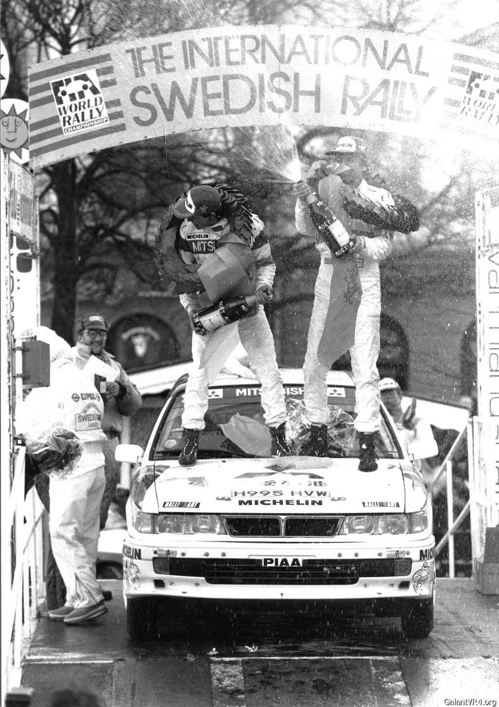 1. Backside is labeled with the Mitsubishi Motors and RalliArt logos (official PR photo). "Kenneth Eriksson / Staffan Parmander Mitsubishi Galant VR.4 Team Mitsubishi Oil Ralliart 1st Overall Swedish Rally 1991"
