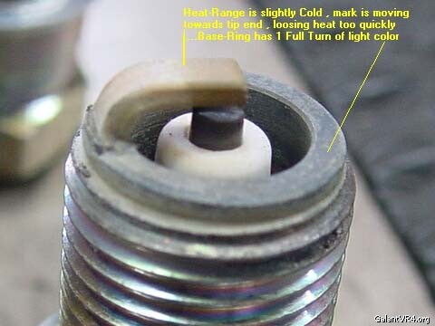 Heat Range = Ground Strap, the ground strap indicates the heat-range of the spark plug. If the "color" of the ground strap "changes" too close to the ground strap's end, (which is above the center electrode), then the heat-range is "too cold", meaning that the strap is loosing heat too quickly to the base ring, and is not able to burn off deposits until near its end.