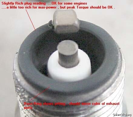 Porcelain = the porcelain shows up preignition/detonation, it will not accurately reveal jetting/air/fuel ratios. To look for the first/beginning signs of detonation, search the white porcelain for tiny black specks or shiny specks of aluminum that have fused to the porcelain. When detonation occurs, part of the air/fuel mixture explodes instead of burning, the explosion is heard as a "metallic knock", this audible knock is the result of a sound shock-wave, this shock wave travels back and forth across the clearance volume "disrupting" the cooler boundary layer gases that cover the entire clearance volume area. This disruption allows "more" heat to be transferred into parts, especially, domes/piston tops,...along with the very rapid rise in pressure like a hammer blow, pistons can get torched with melted sides and holes !!! With the early signs of detonation, the shock-wave will also rattle rings causing the tiny amounts of oil that now gets by rings, to be fused to the white porcelain as tiny black specks, also fused as specks are soot that was clinging to clearance volume surfaces in the relatively "still-air" of the boundary layer. One step beyond the black specks, will be tiny specks/balls of aluminum coming off the pistons that will be fused to white porcelain,....the next step to be reached is occasional pieces of the porcelain being broken-off as detonation gets worse, ETC. Soon after that are holes, blown head gaskets, broken connecting rods, ETC.