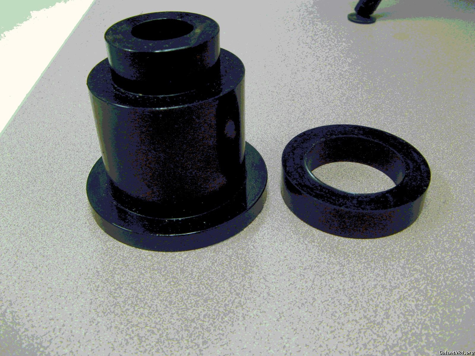 Now the steel bushing. It was cut off the interpiece saved from above. Razor blade and wirewheel works for this. As the bushing goes in it actually pushes out on the polyurethane. This continues to help lock these in the subframe.