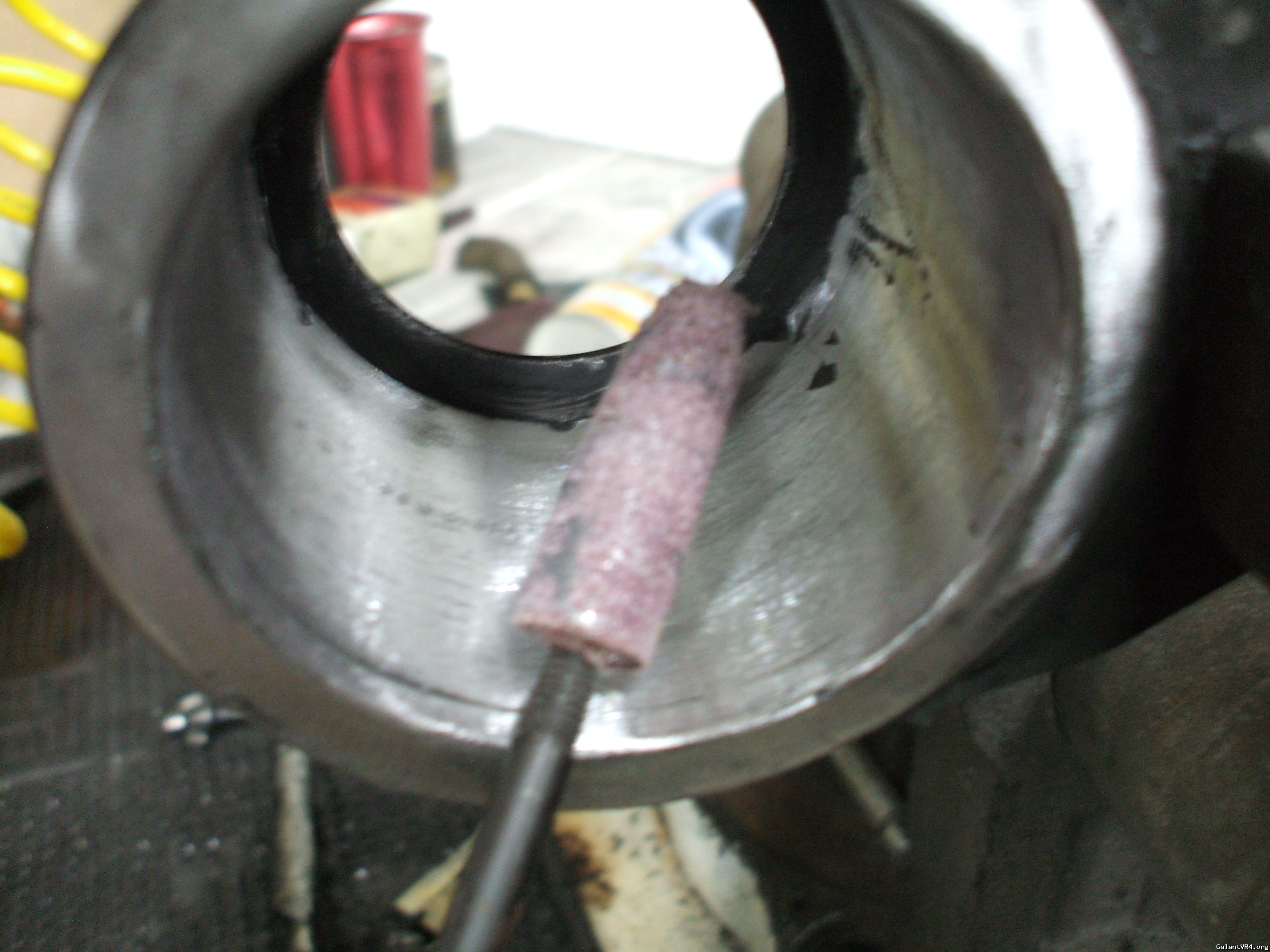 Now after the torch I used these. 90 degree die grinder with a sand pad for the outside edge and inside I used a normal die grinder with a cartridge roll same used for porting heads. You want need all this a dremal with a sanding drum, a drill with a sanding drum or just the grinding wheel will do what this did but I had an auction ending on ebay I was watching so I needed to hurry. This is what it looks like with the rubber gone and ready for install.