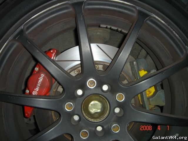 Evo Brembos rear brakes on a 1G. Handbrake runs off the factory caliper. I wonder if they've just drilled two new holes on the left hand side for a bracket...