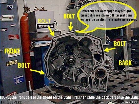 Pull up on the small water pipe and use a prybar (similar) to massage the soft alum. water pipe a way from bellhousing to make space for the shield. Be careful not to got nuts and create a leak. I have run into car that needed not massage and cars that needed a health dose but trust me if you are careful it will fit like a glove under the pipe.